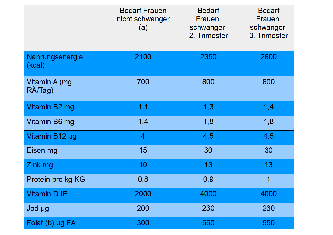 - Folat: Folat oder auch Vitamin B9 ist vor allem vor der Zeugung und in den ersten Wochen/Monaten wichtig. Siehe auch (b) unter der Tabelle. Aber auch später ist der Bedarf erhöht. Folsäure kommt viel in grünem Blattgemüse, Hülsenfrüchten, Vollkorngetreide und Getreidekeimlingen vor. Es ist hitzelabil, lichtempfindlich und oxidationsanfällig. Je nach Ernährung kann eine Supplementierung während der Schwangerschaft sinnvoll sein.